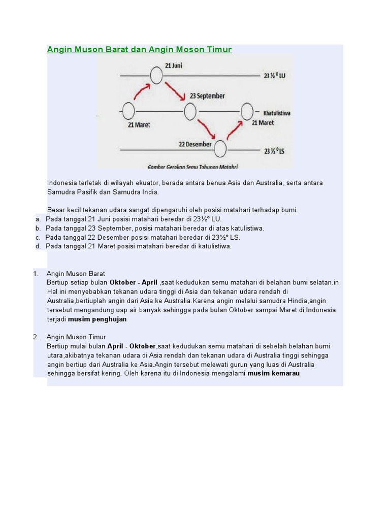 Angin muson barat dan muson timur. Di indonesia, ada dua musim yang berubah setiap 6 bulan : Angin ini bertiup saat matahari berada di belahan bumi selatan, yang menyebabkan benua australia musim panas, sehingga bertekanan minimum dan benua asia lebih dingin, sehingga tekananya maksimum. Angin muson timur yang bersifat kering bergerak dari arah tenggara indonesia pada bulan mei hingga. Dari bulan november hingga maret, angin bertiup dari arah barat laut membawa banyak uap air dan hujan di kawasan indonesia;